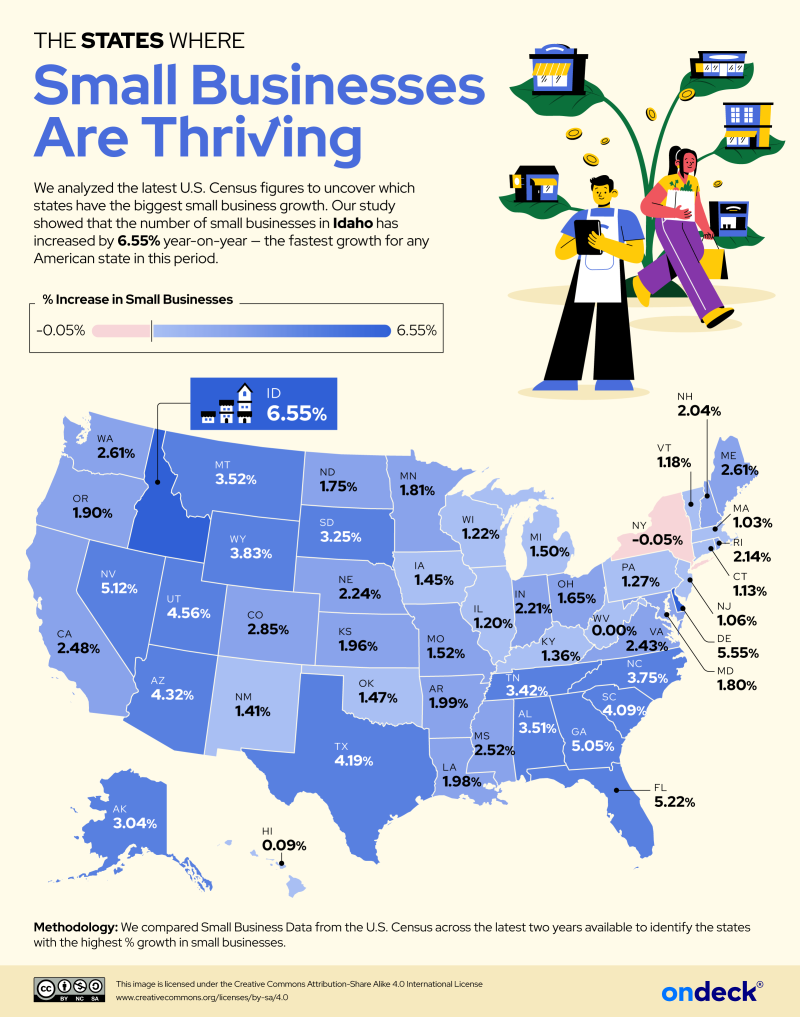 We used Small Business Data from the U.S. Census to identify the states, metropolitan areas and counties across America with the highest percentage growth in the number of businesses with fewer than 500 employees according to the